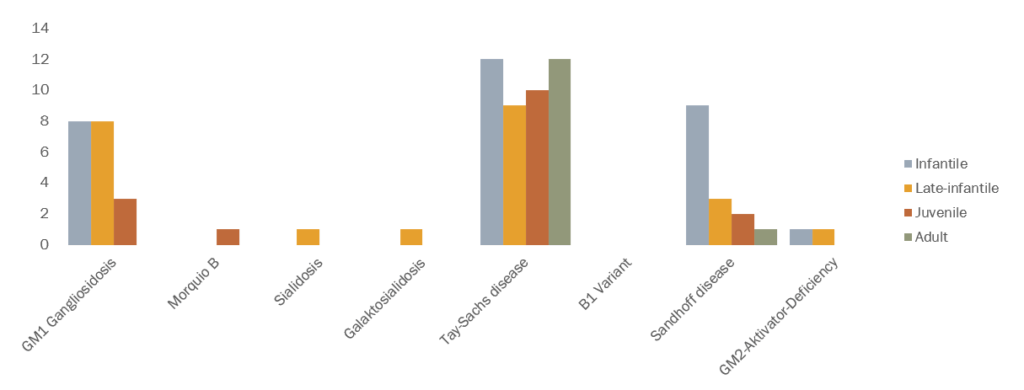 • juvenilní nebo dospělá forma GM2 gangliosidózy